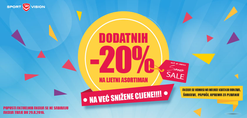 Izaberite omiljene Nike, adidas, Champion, Converse, Ellesse, Reebok, Lonsdale i brojne druge artikle i iskoristite 20% popusta već snižene cijene. Posjetite najbližu Sport Vision prodavnicu ili pogledajte naš online katalog OVDJE.
